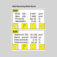 Mode Bulk density (Adopting water saturation method) Porous material : Show Bulk density, Wet density, Porosity, Absorption, Apparent Density, Open pores, Close porosity, Total porosity